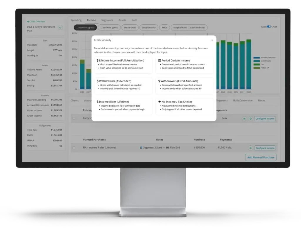 Model potential annuity purchases and compare multiple product options within the context of complete client income strategies.